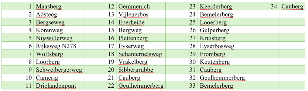 Dopo la partenza da Maastricht, il percorso gira verso Sittard e Geleen, per poi tornare verso Ubachsberg, Simpelveld e Nijswillerweg, dove verranno affrontate le salite iconiche di Loorberg (1,6 Km al 4,9%), Camerig (4,6 Km al 4%) e Vaalserberg Drielandenpunt(3,3 Km al 4,2%), il punto più alto della gara e dove i confini di tre stati (Paesi Bassi, Germania e Belgio) convergono in un unico punto.