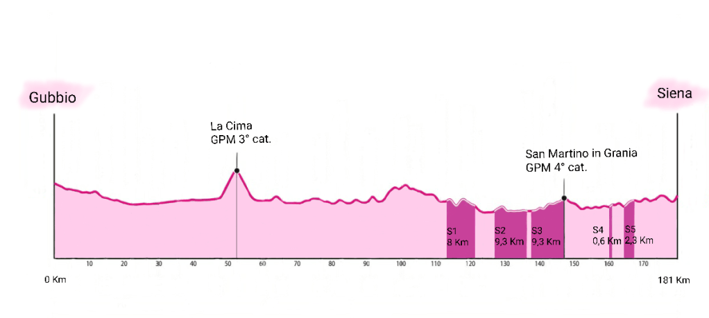 Con la tappa da Gubbio a Siena gli atleti assaggiano le Strade Bianche: sono infatti 5 i settori di sterrato posti nella seconda metà di tappa (181 Km con un dislivello di 2500 m). Come per le strade bianche, la grossa incognita sarà appunto il terreno. Molto dipenderà dal meteo dei giorni precedenti e dall’umidità, ma a rimanere invariato è il rischio foratura. Dall’ultimo settore di sterrato al traguardo ci sono circa 15 Km, abbastanza per recuperare in caso di incidente meccanico, ma in caso di ritardi importanti ci sarà da spendere molte energie per tornare in gruppo ed è una situazione in cui nessun capitano vorrà trovarsi.