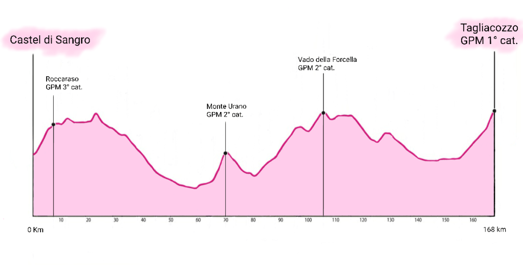 Infatti, da Castel Di Sangro a Tagliacozzo c’è un dislivello di 3500 m racchiuso in 168 Km, con arrivo in salita. Di questa tappa, che comprende in totale 4 GPM (3° cat., 2° cat., 2° cat., 1° cat.) è curioso notare come il Red Bull Km è posto proprio ai piedi della salita finale verso Tagliacozzo, a circa 12 Km dal traguardo: è possibile, quindi, che la salita venga presa a grande velocità se c’è qualcuno che ambisce sia ai secondi di abbuono sia alla vittoria di tappa.