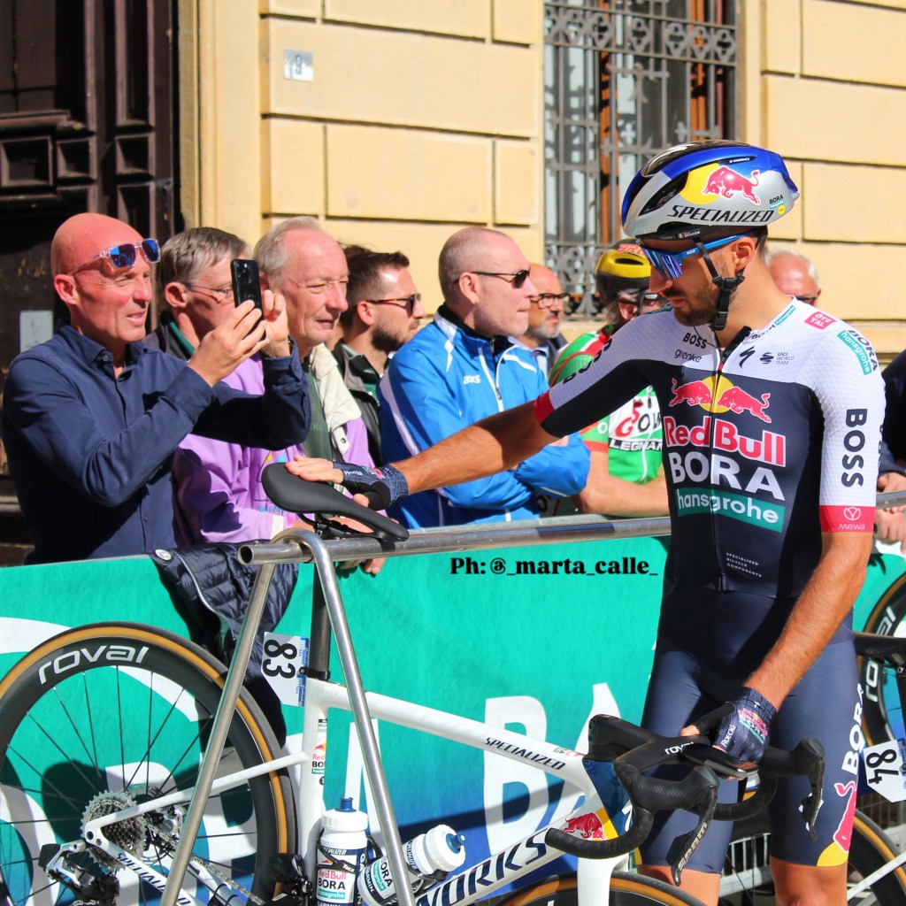 Proprio quando ho pensato che non c’era più niente da vedere e che mancava solo la partenza accade quello che mai mi sarei aspettata di vedere dal vivo, ovvero il tunnel di bici che accompagna al via il ciclista che corre l’ultima gara della sua carriera. Con il senno di poi ammetto che avrei dovuto immaginarlo, sapevo che Nizzolo avrebbe corso l’ultima gara alla Coppa Bernocchi. Forse per la novità della situazione, forse per l’inesperienza non ho proprio pensato a questa possibilità e per questo non ho purtroppo nessuna foto.